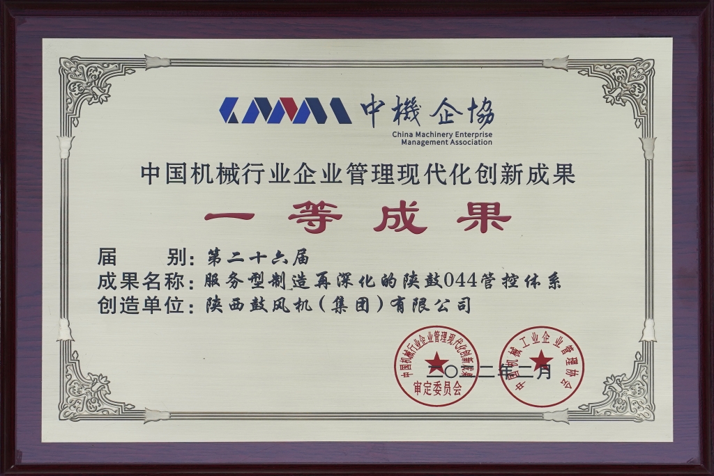 • 2022-“服務(wù)型制造再深化的陜鼓 044 管控體系”?榮獲第二十六屆中國機械行業(yè)企業(yè)管理現(xiàn)代化創(chuàng)新成果一等獎